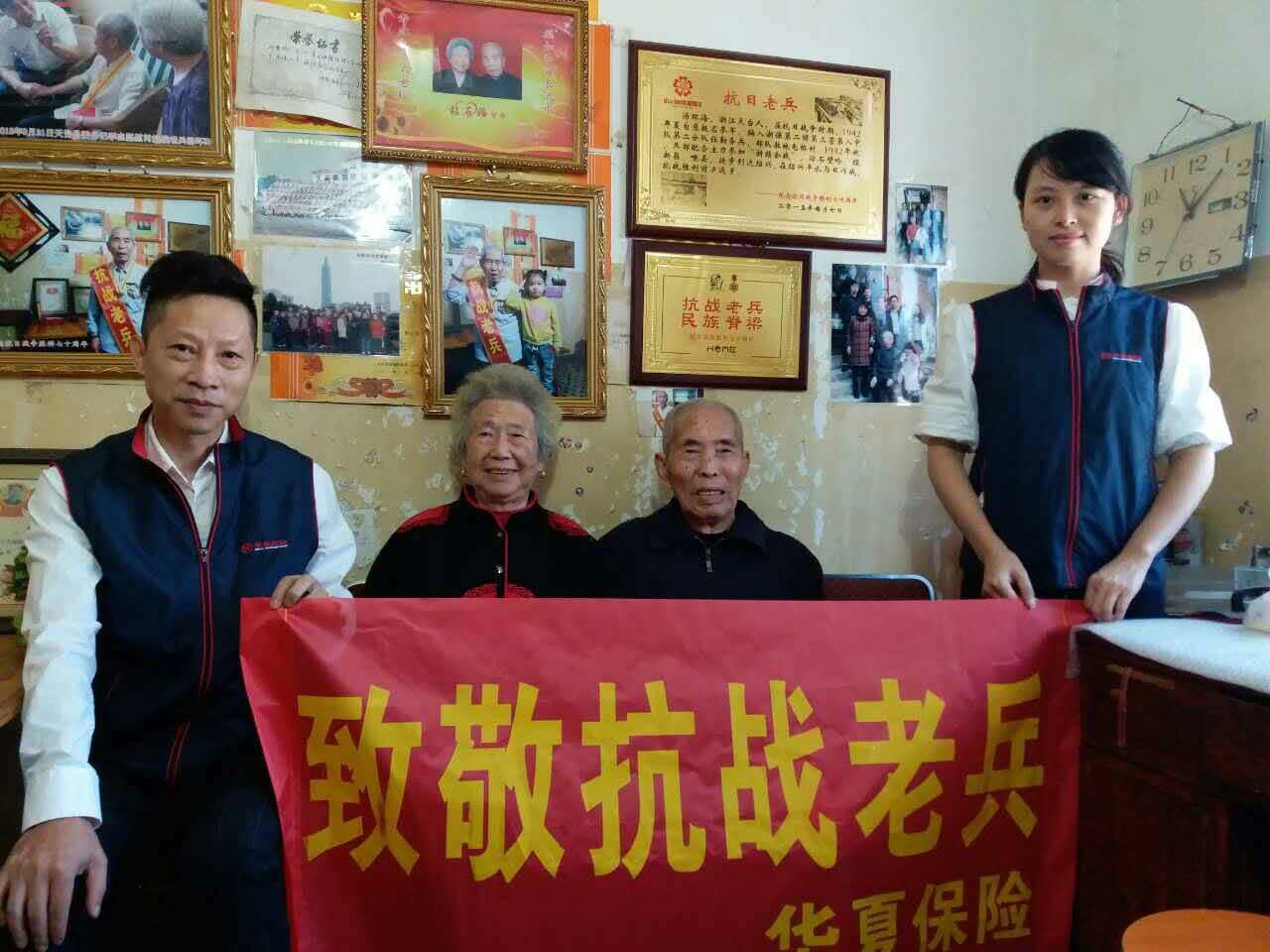 2017年度重阳节当天,华夏保险台州中支联合台州骨科医院和天台县红心社组成爱心小分队,走访看望了天台的10位抗战老兵,为他们送上节日祝福并带去了棉被、牛奶、油、营养品等生活用品。为了更好的帮助这些老年人安度晚年,爱心小分队还带来了医生,对当天走访的10位抗战老兵进行体检并建立了健康档案,时刻保持关注与关怀。