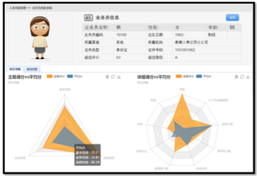 近日,泰康宣布信用体系管理系统正式上线,这标志着泰康在业内率先建立起企业内部信用体系。这也是泰康进一步落实保监会“‘1+4’系列文件”,解决行业痛点的重要举措。该管理系统是记录内外勤人员信用行为的大数据平台,共开发11类48项数据记录功能,全面记录内部人员与客户之间、与公司之间的各类信用行为。该系统还具有多维度分权重的信用评价功能,可以将个人信用以诚信评分的方式直观展现。