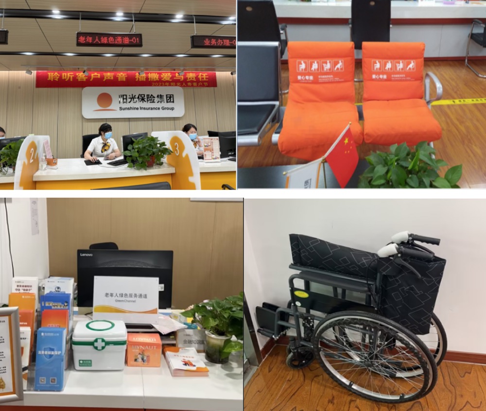 一方面,阳光保险在线下门店开通老年人绿色服务通道,工作人员全程指引老年客户优先办理业务。各网点设置“敬老服务区”,配备爱心座椅、老花镜、轮椅和急救药品等设施,让老年人畅通办理保险业务。