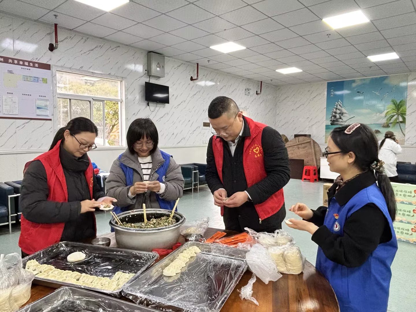 活动当天,三家机构的党员志愿者们带着慰问物资与真挚心意抵达托老院。在温馨融洽的氛围里,志愿者们迅速分工协作,调馅、包饺子,动作娴熟、配合默契。经过一个多小时的通力合作,为老人们准备的800多个饺子整齐排列,静待下锅。